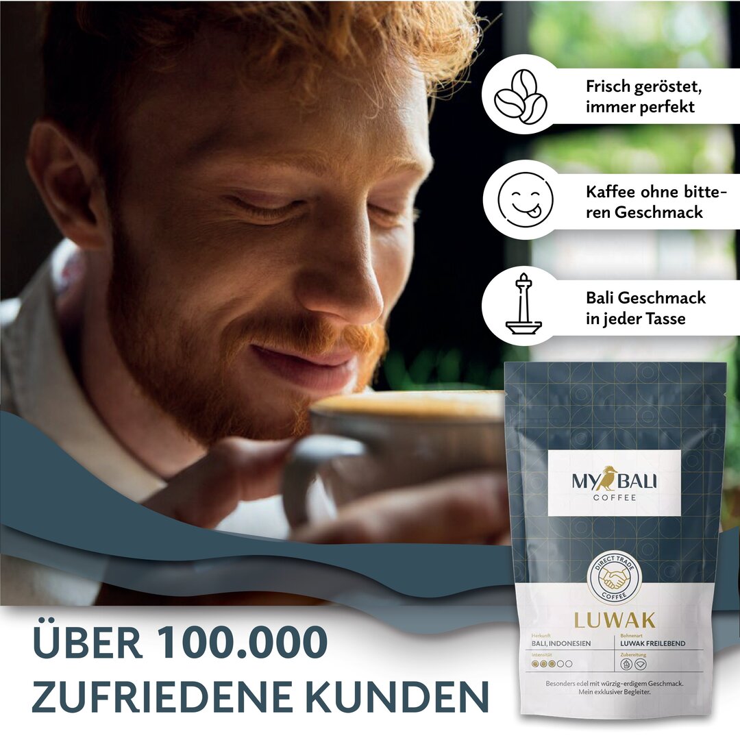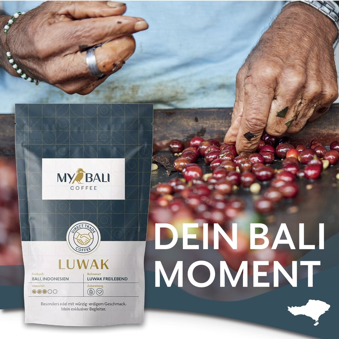 Hast du schon mal von “Katzenkaffee” gehört? Kopi Luwak ist eine der exklusivsten Kaffeesorten, extravagant und außergewöhnlich. Einzigartig wird der Kaffee durch die Luwak Schleichkatze, die mit Vorliebe nur die feinsten und saftigsten Kaffeekirschen verspeist, verdaut und an- schließend wieder unversehrt ausscheidet. Die Kaffeebauern reinigen und rösten diese, hierdurch entsteht ein edler Kaffeegenuss der Extraklasse.