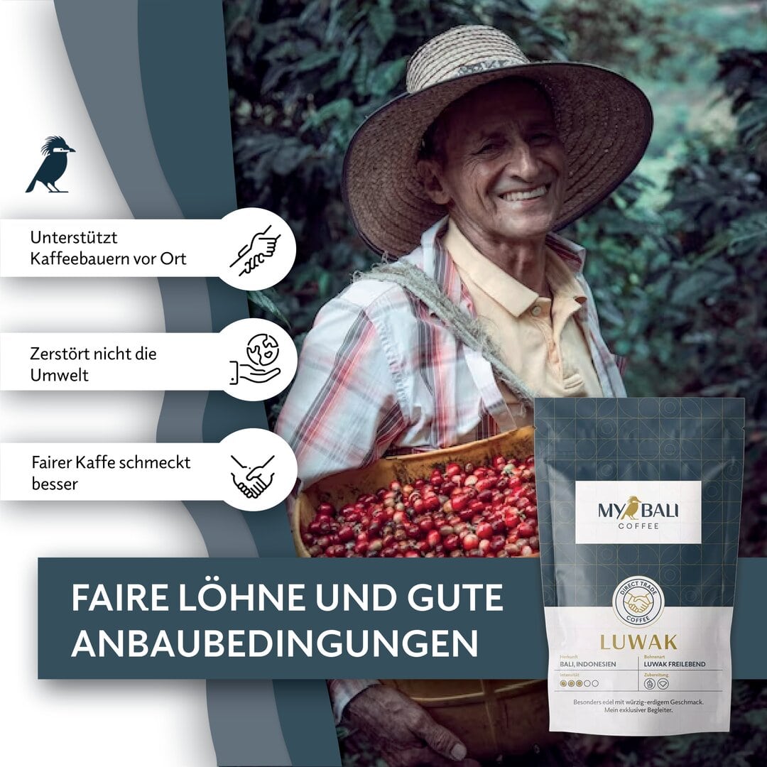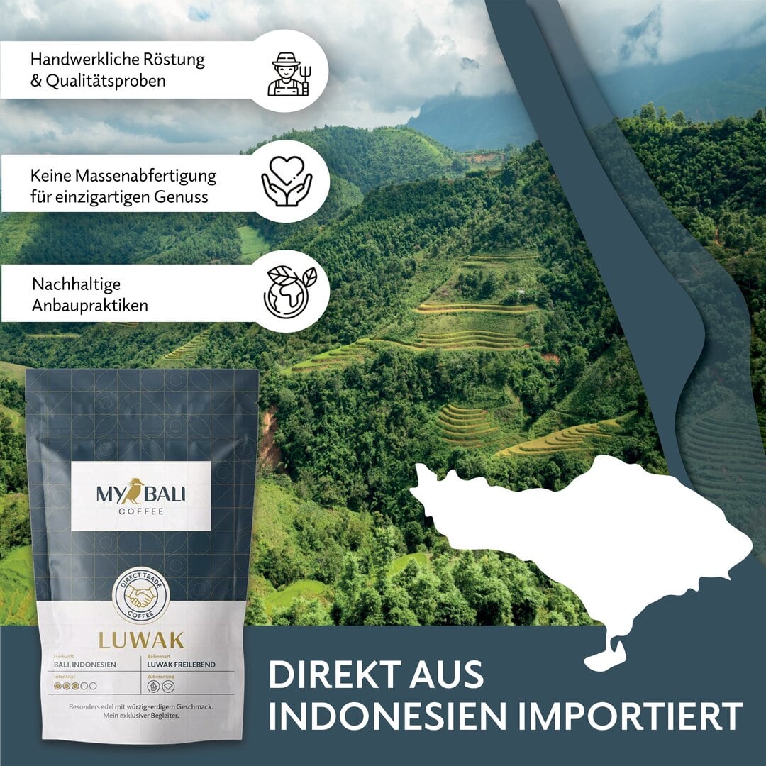 Unser Kopi Luwak ist etwas ganz Besonderes. Wir sammeln die Bohnen in der Natur von ausschließlich freilebenden Luwaks, so hat der Fleckenmusang die Möglichkeit sich die besten und reifsten Kirschen vom Baum zu pflücken, eine natürliche Auslese. Der fermentierte Kaffee hat einen lang anhaltenden mild würzigen, leicht pfeffrigen Geschmack.
