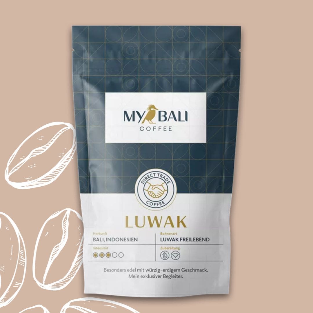 Der Luwak, auch Fleckenmusang genannt, ist eine Schleichkatzenart und lebt in den tropischen Wäldern Indonesiens. Er ernährt sich unter anderen von Kaffeekirschen, dabei frisst er nur die besten und reifsten Kirschen vom Baum. In seinem Verdauungs- trakt durchlaufen die Kirschen dann einer ganz besonderen, unvergleichbare Fermentation, die sich von allen anderen Kaffeeaufbereitungen unterscheidet. Die Enzyme im Darm entziehen der Bohne die Bitterstoffe und Säure. Der Kaffee erhält dadurch sein einzigartig, mildes Aroma. Dein exklusiver Begleiter.