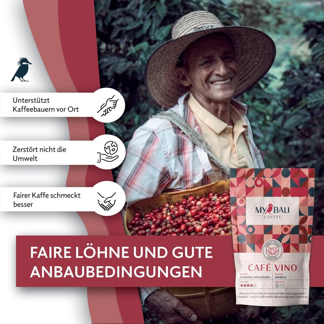 Unser Café Vino ist die Innovation am Kaffeemarkt. Die Kaffeekirschen werden im Unterschied zu herkömmlichem Kaffees nicht direkt gewaschen und getrocknet, sondern dürfen genau wie ein guter Wein noch über drei Monate gären. Dadurch erhält unser Café Vino seinen fruchtigen Geschmack mit einer feinen Säure, die an einen guten Rotwein erinnert. Natürlich genießt du unseren Kaffee alkoholfrei. Deine einzigartige Delikatesse.