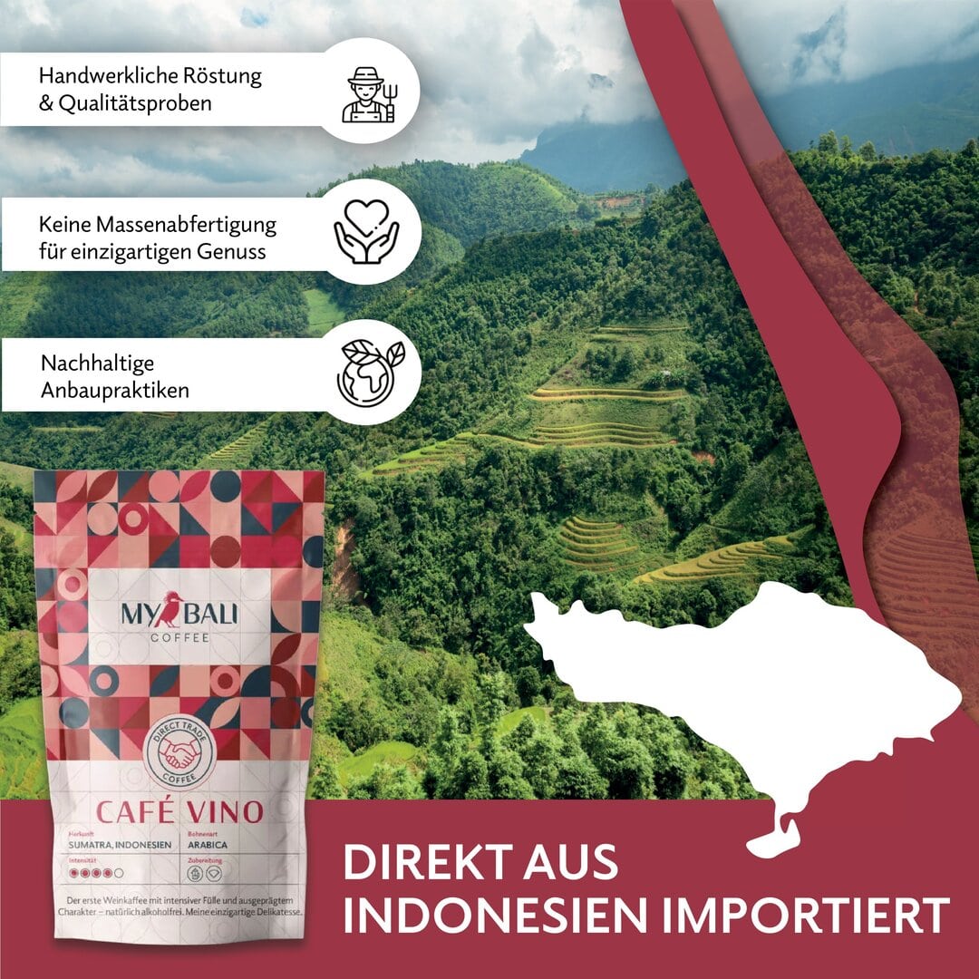 Unser Café Vino wird in der Provinz Aceh (Gayo Hochland) auf der indonesischen Insel Sumatra angebaut und geerntet. Dort reift er in tropischen Mischwäldern auf ca. 1500 Metern Höhe.